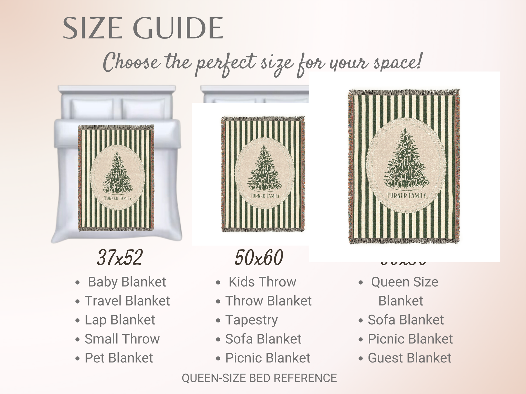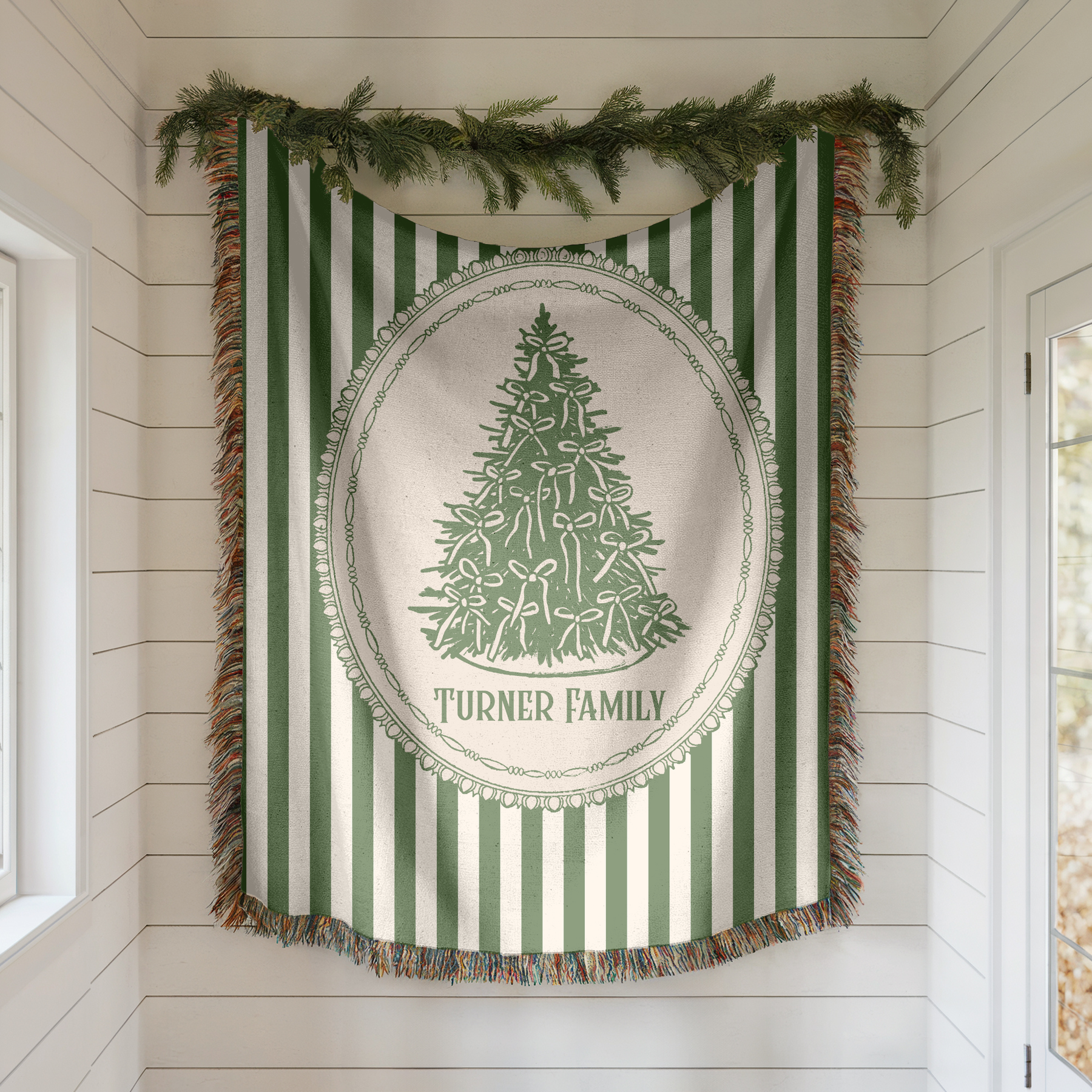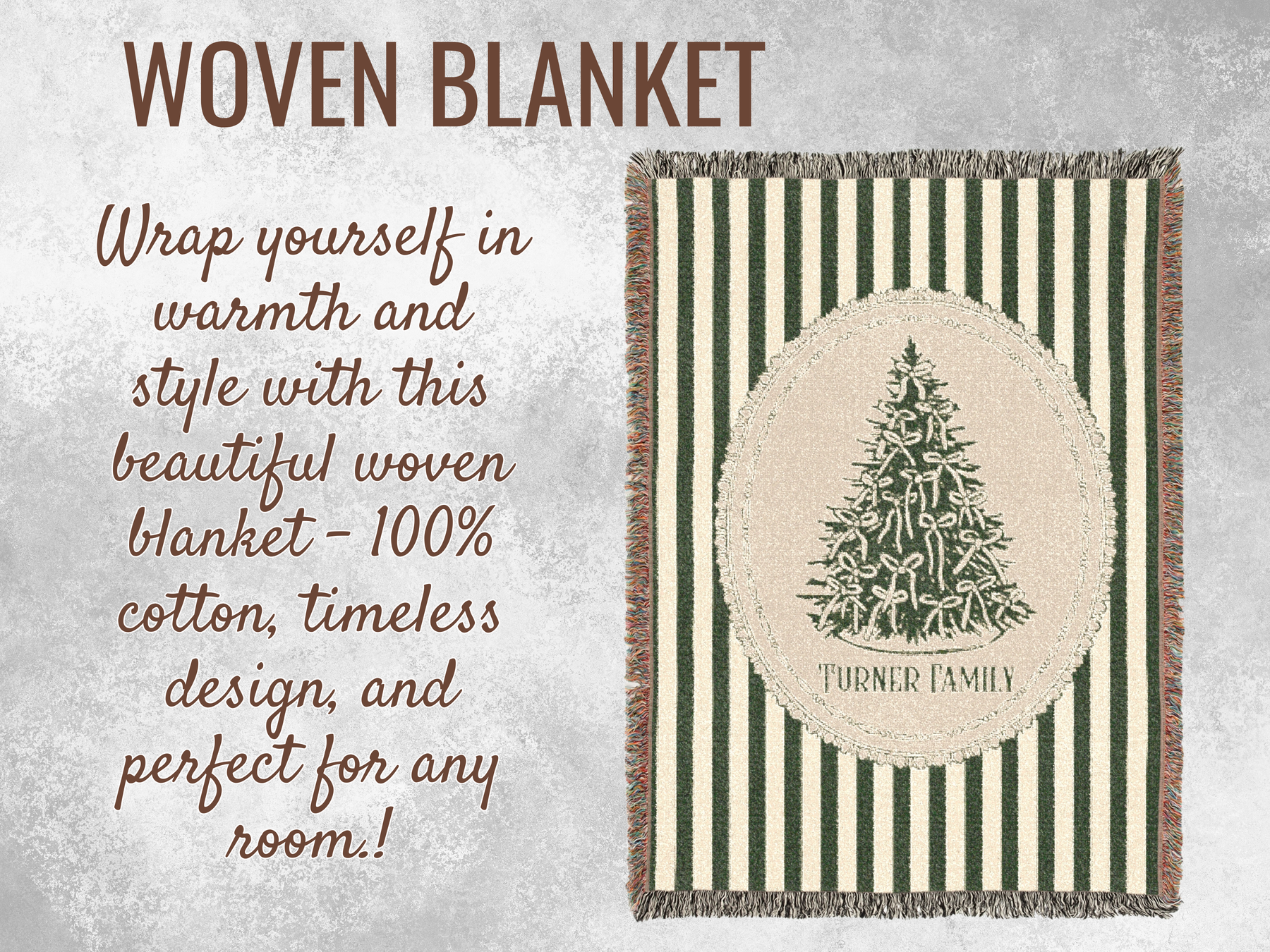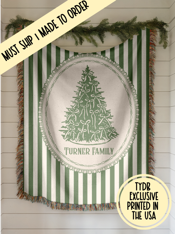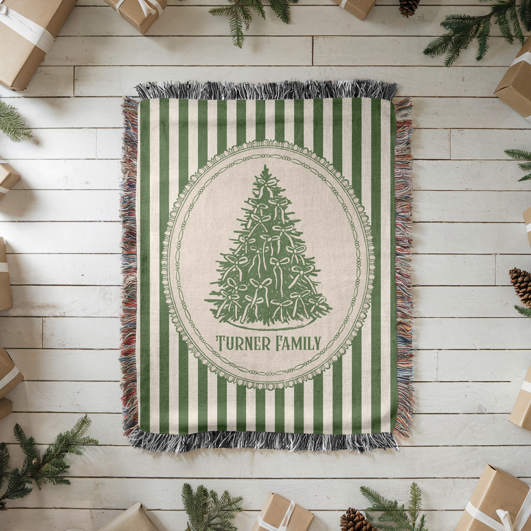 Add a timeless touch of Christmas elegance to your home with this custom woven holiday blanket, featuring vintage green stripes, a hand-drawn ribbon-tied Christmas tree, and a classic oval frame. This design blends traditional charm with cozy seasonal style—perfect for decorating or snuggling up during the holidays.