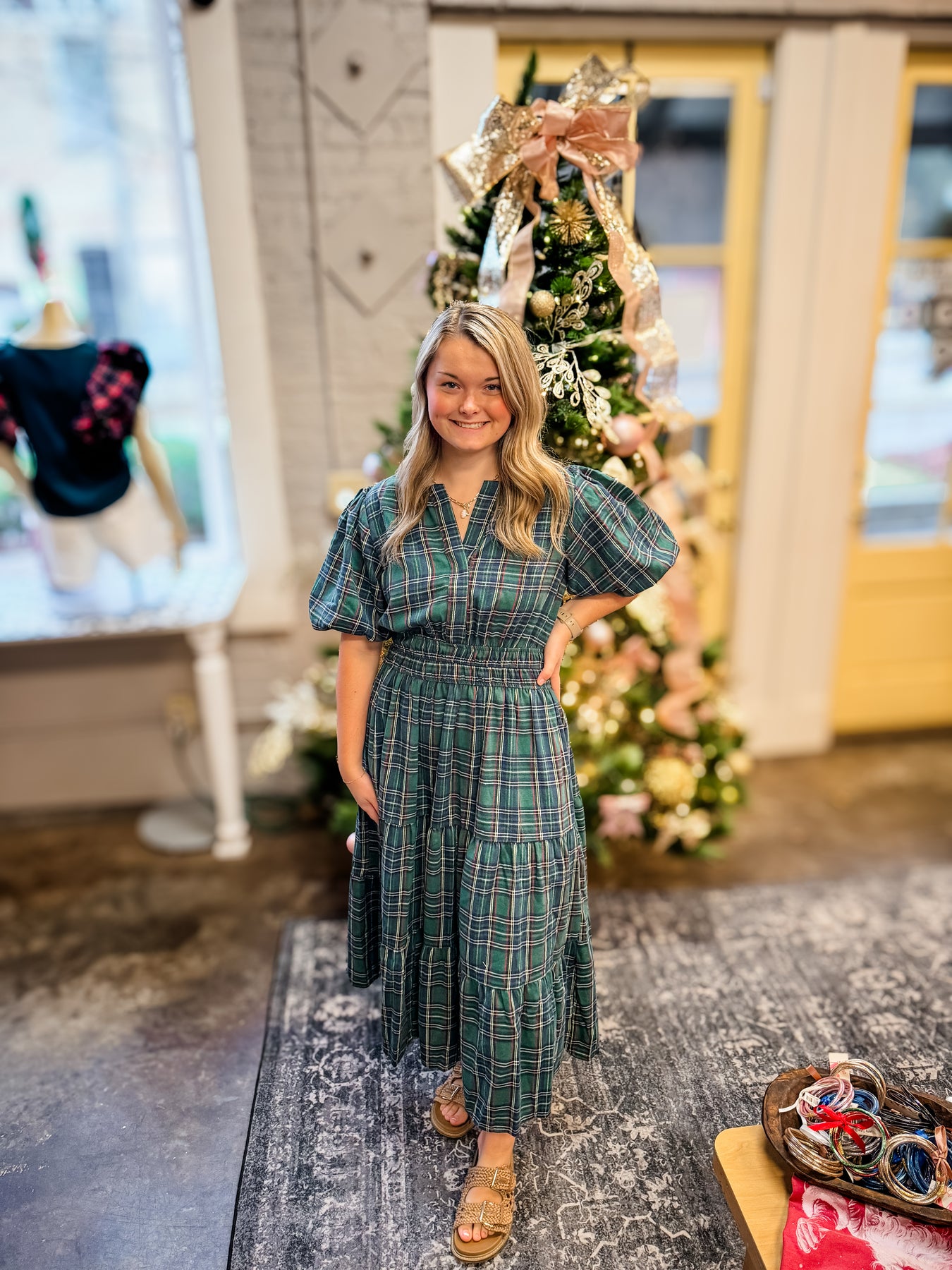 Our Evergreen Plaid Midi Dress is the definition of timeless charm. Featuring puff sleeves, an elastic waist, and pockets (yes, pockets!), this dress is perfect for holiday parties, family photos, or Sunday brunch. Pair with boots and a cardigan for a cozy winter look.