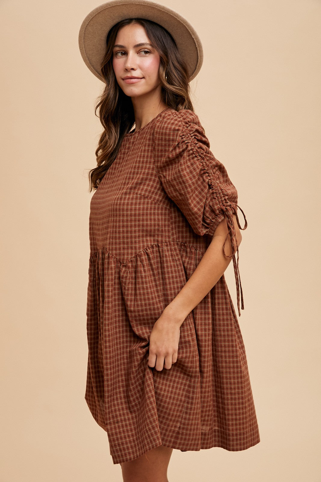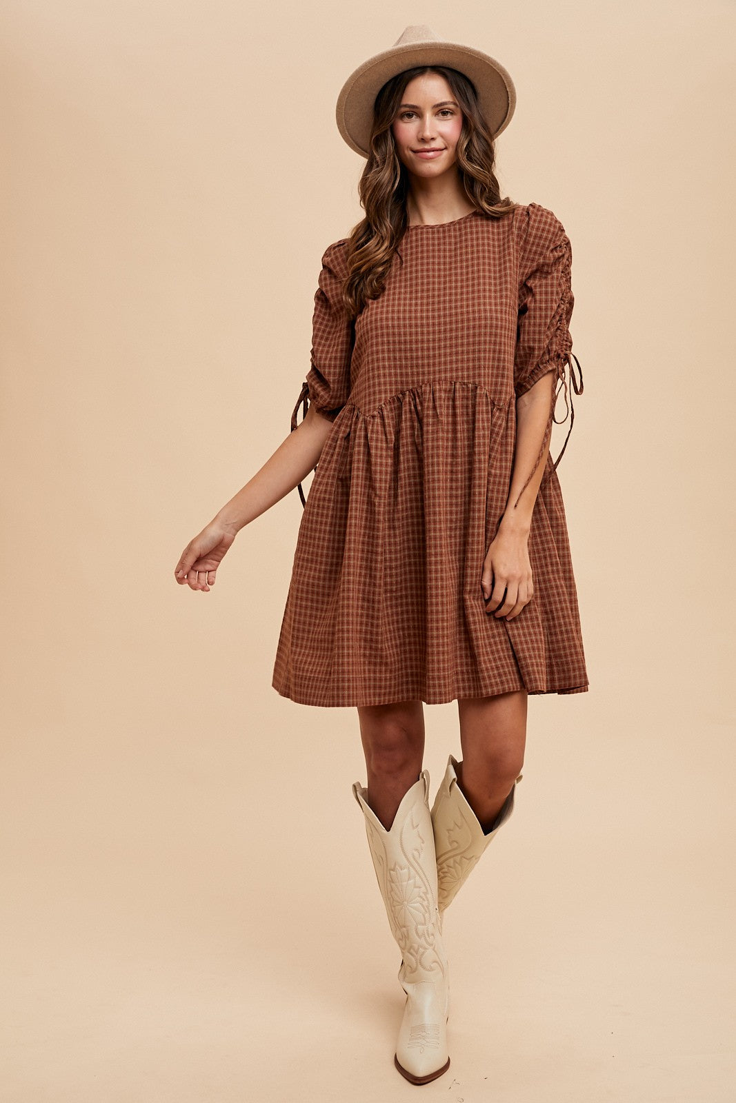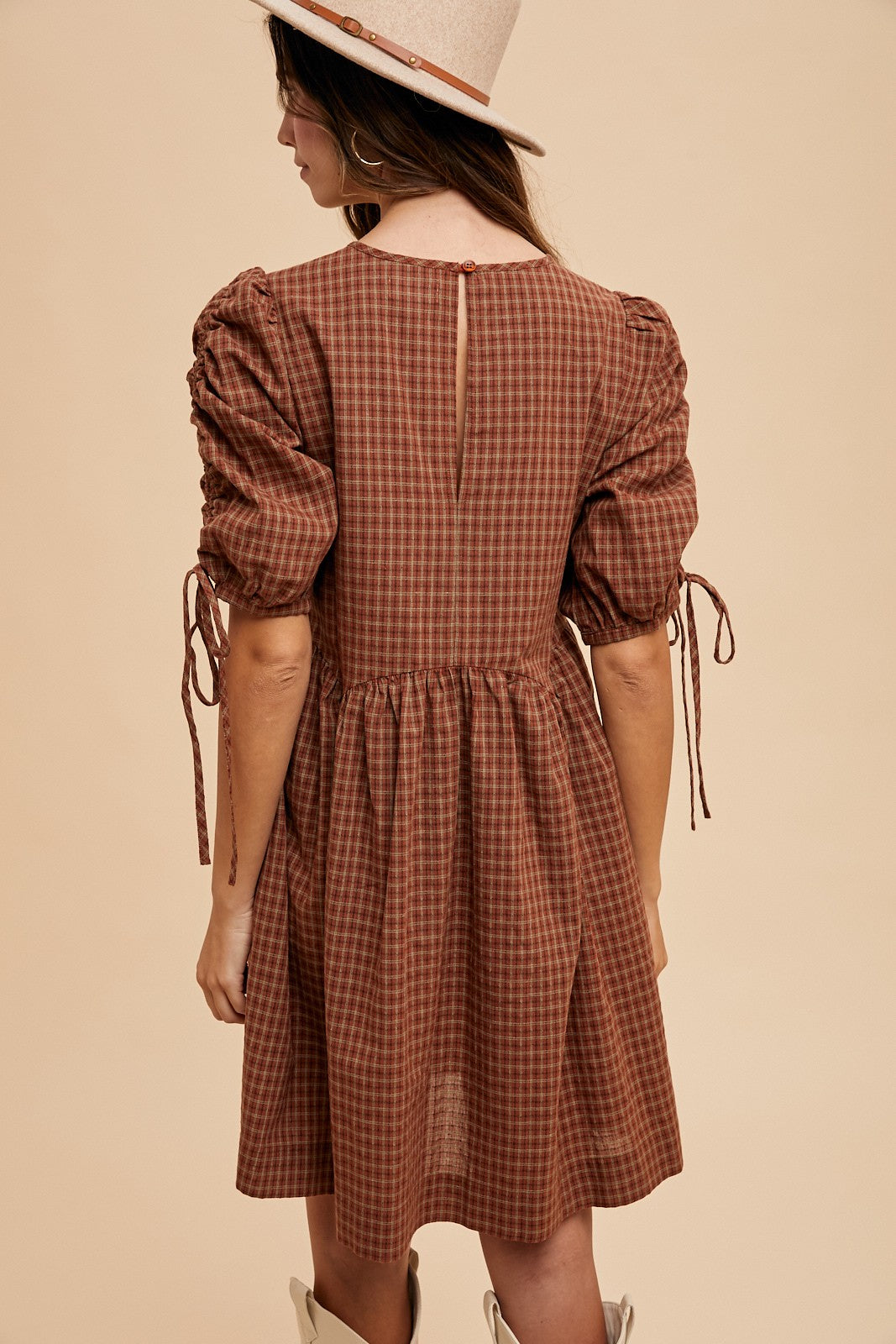 Meet your new fall favorite — this charming plaid babydoll dress blends cozy, country style with everyday comfort. Made from 100% cotton, it features ruched puff sleeves with tie details, a soft round neckline, and a flattering scalloped waistline that flows into a relaxed, mini-length skirt.