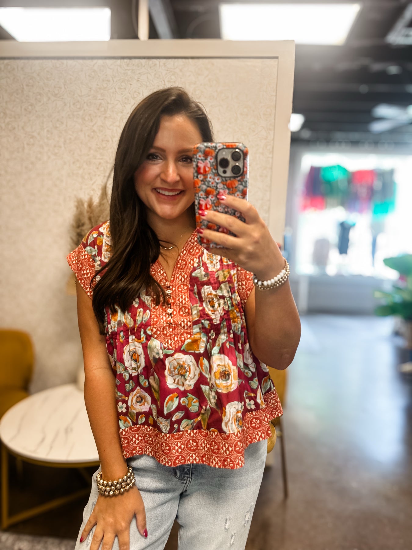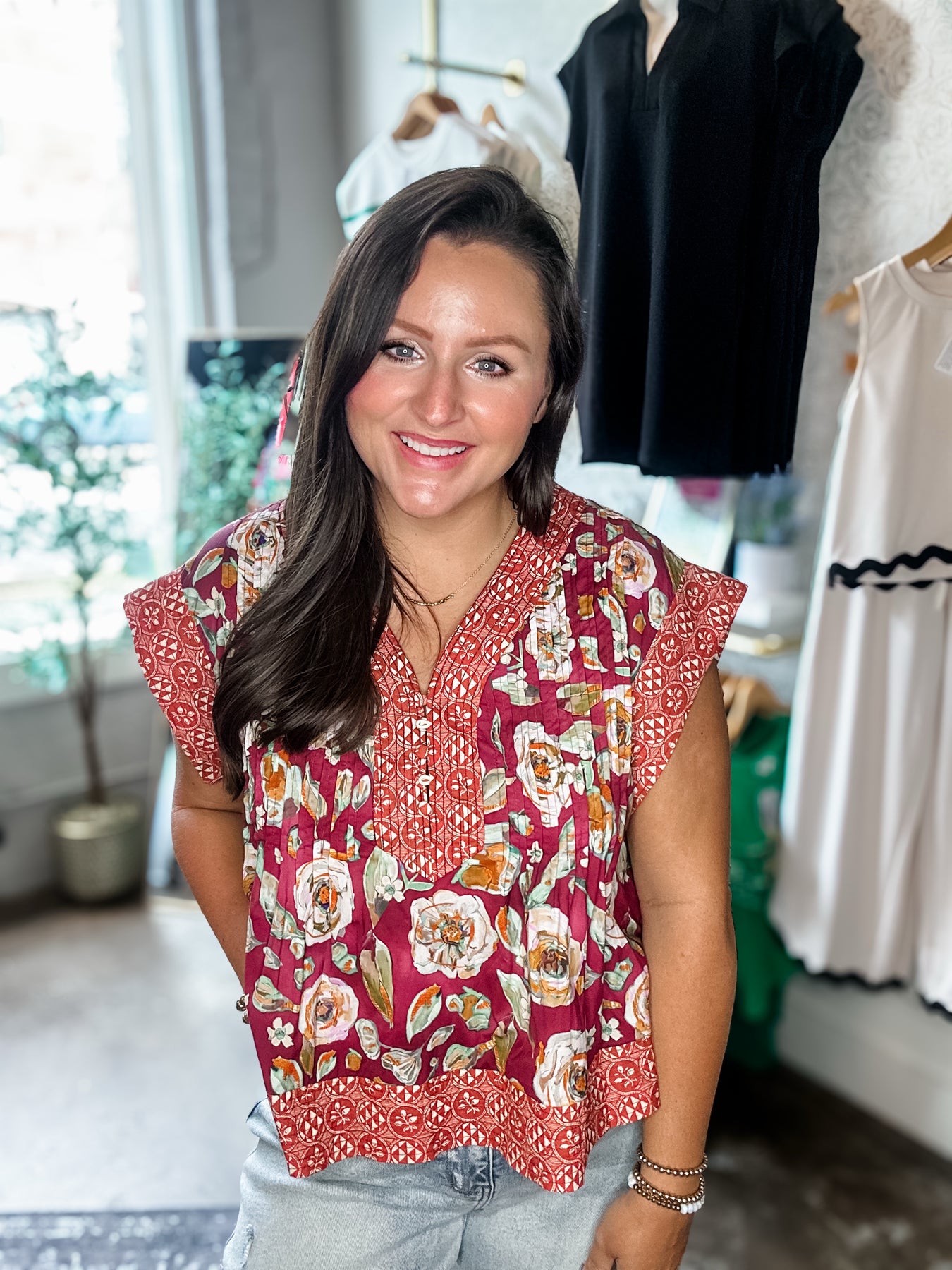 Bring rich fall vibes to your wardrobe with our Harvest Blooms Pintuck Top. Designed in soft 100% cotton, this lightweight woven blouse features a mix of floral and geometric prints with contrast banding at the neckline, hem, and placket for an artisan-inspired look. Pintuck detailing and exposed stitching add extra charm, while the slit sleeve band keeps it breezy and flattering. Available in earthy olive tones or a warm burgundy palette, it’s the perfect top for everything from pumpkin patch strolls to casual dinner nights.