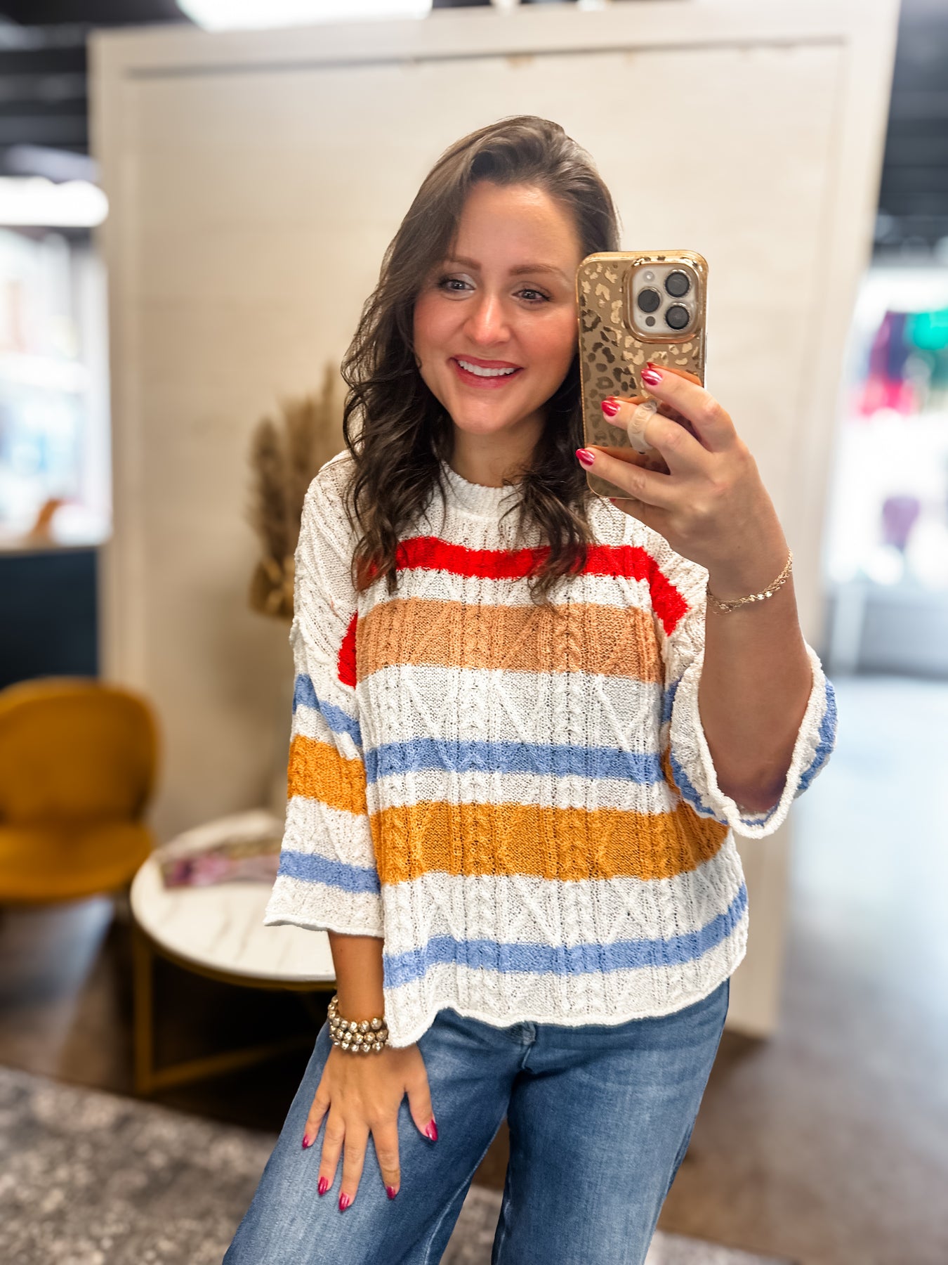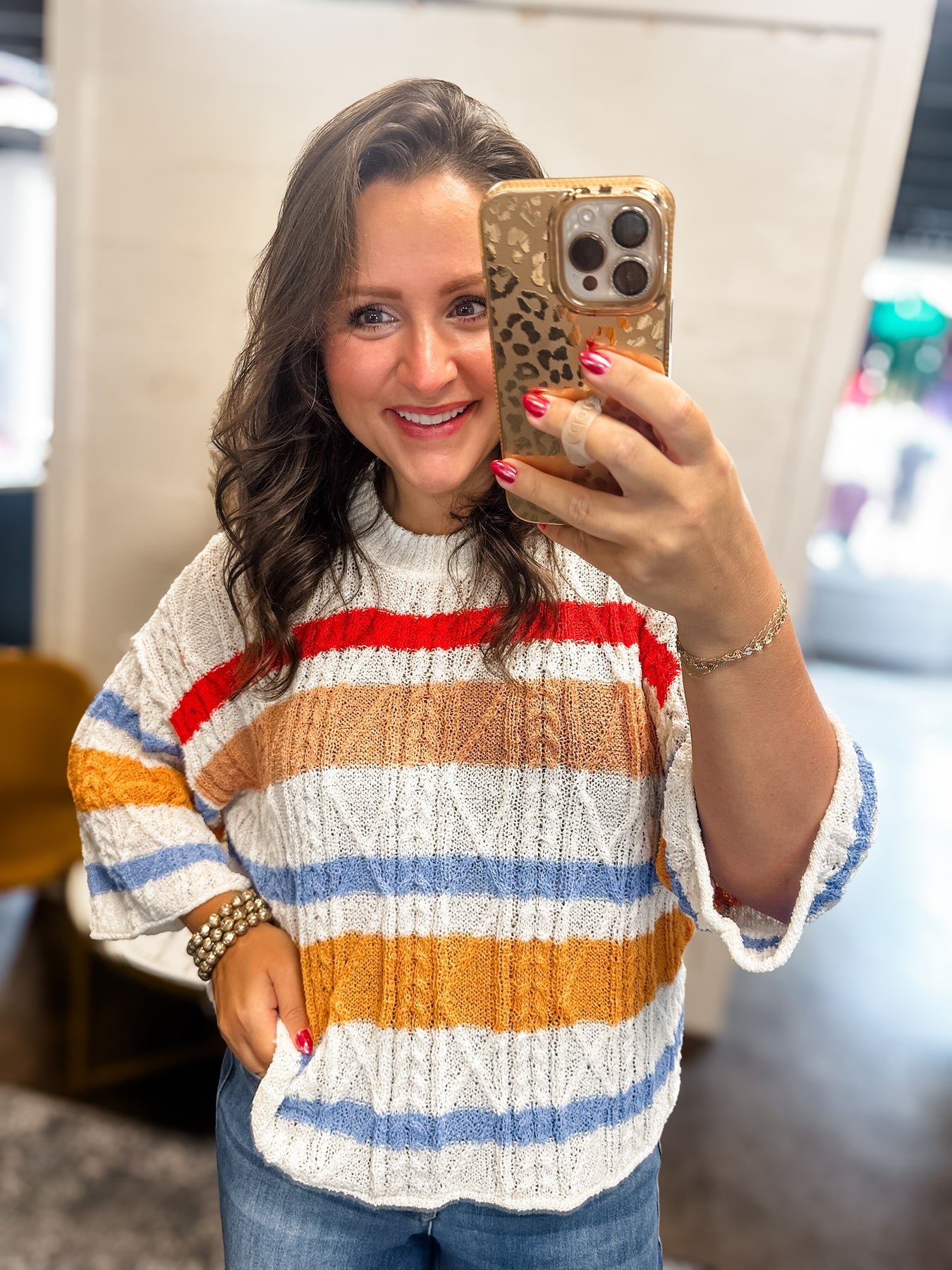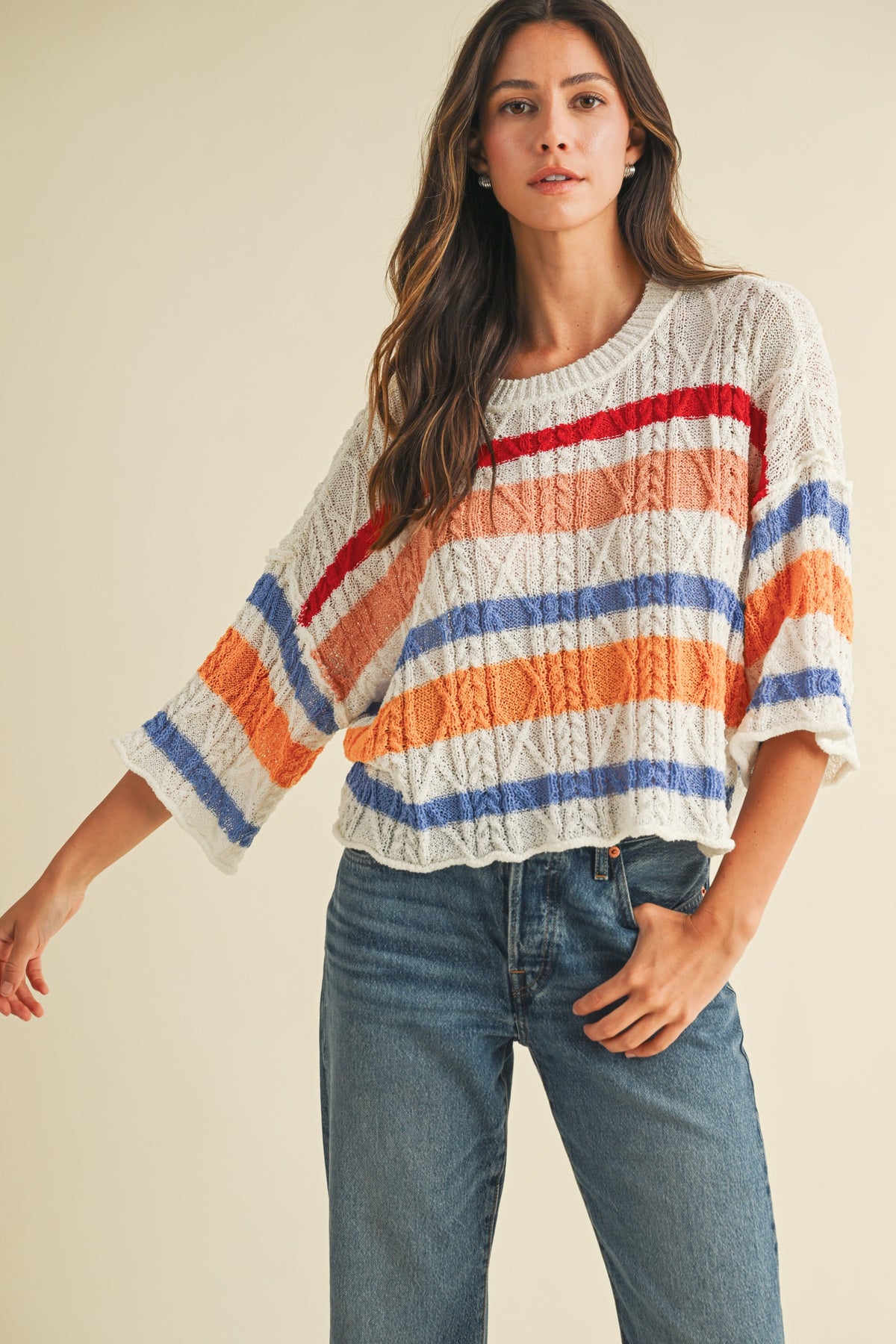 Show your spirit in style with this lightweight, loose-fit sweater — featuring bold multi-colored stripes and cozy cable-knit texture. The cropped length and ¾ sleeves make it perfect for early fall afternoons, stadium hangs, and cheering on your team in comfort.