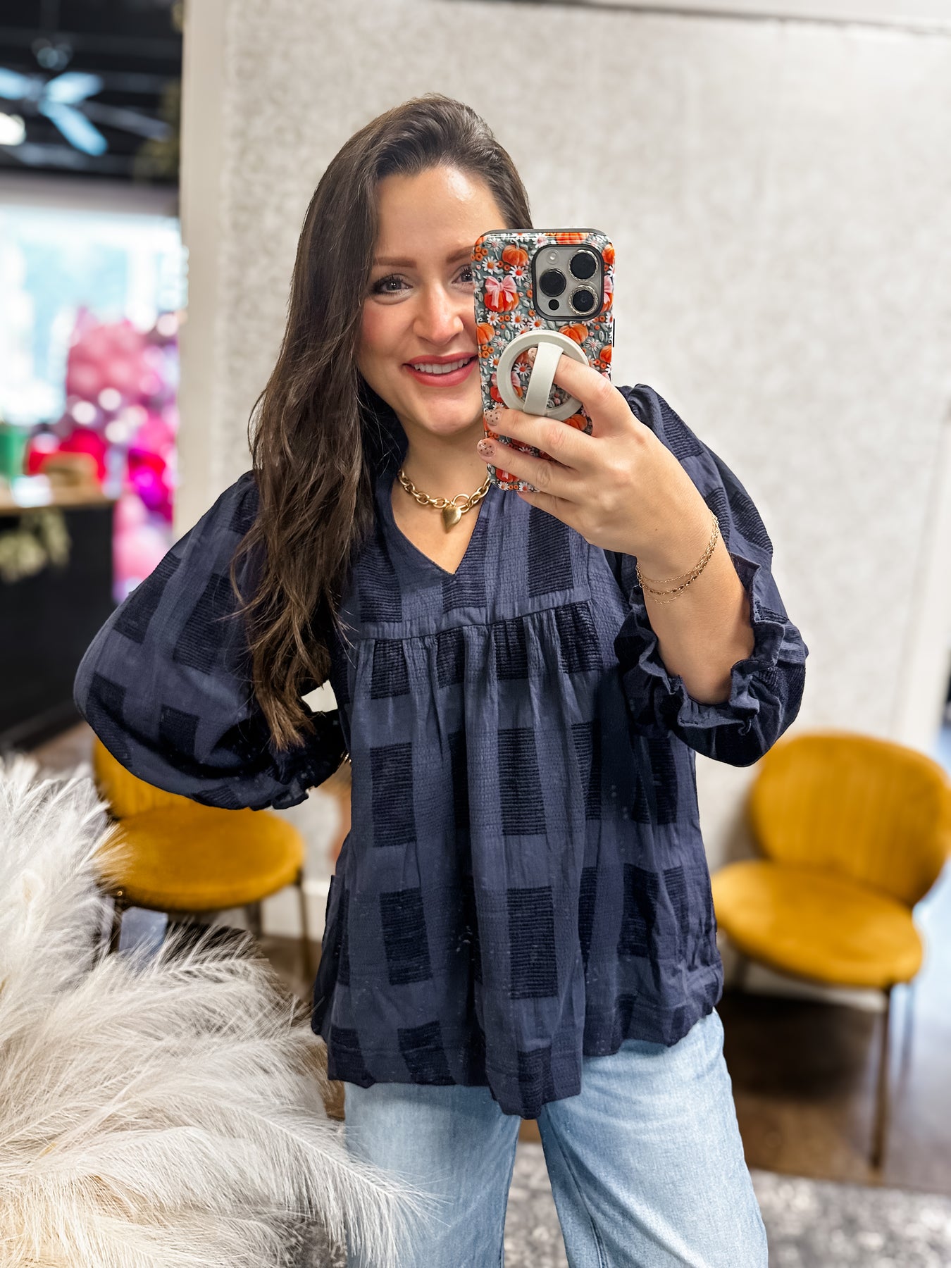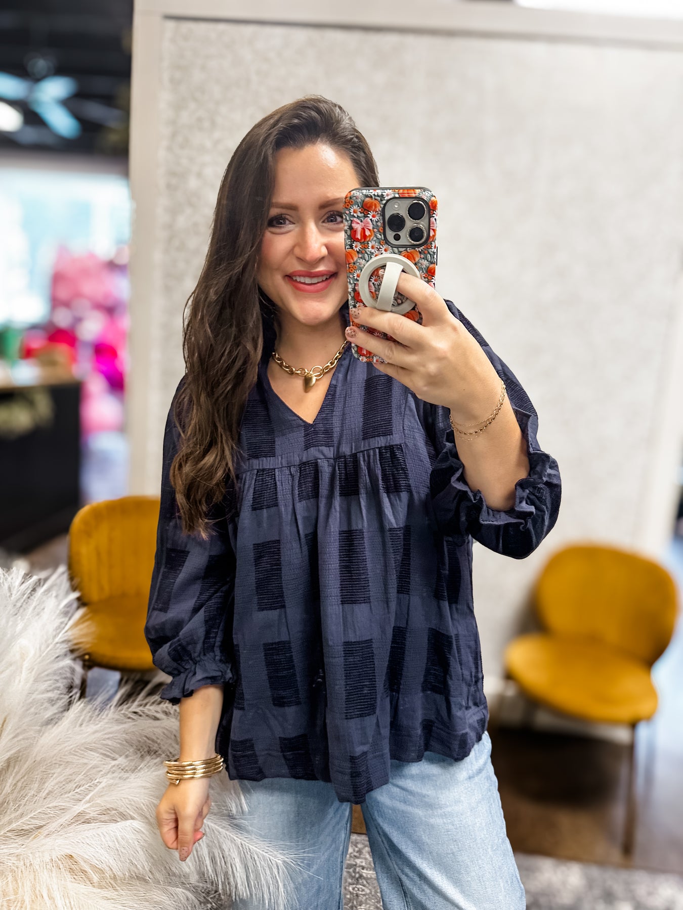This jacquard top features a rich patterned weave, a ruffle-trimmed high neckline, and billowy ruffle-cuffed sleeves. The boxy cut gives it a modern, relaxed feel while maintaining an elevated, boutique look.