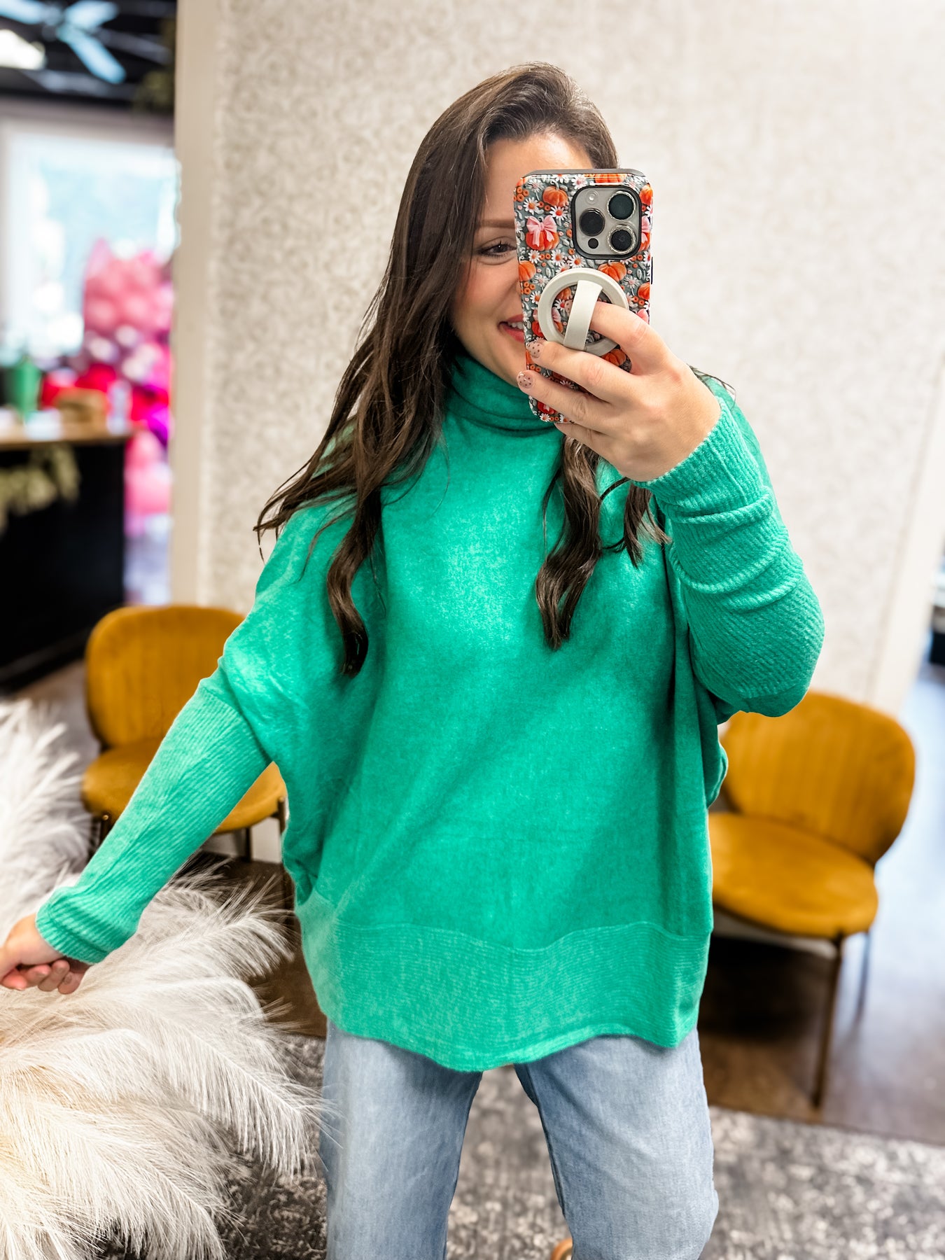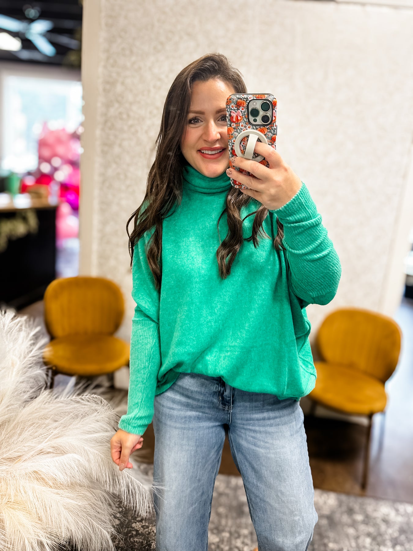 This brushed melange hacci turtleneck sweater is the definition of soft, slouchy, and effortlessly cozy. The relaxed poncho-style fit, ribbed hem, and dreamy turtleneck make it perfect for chilly mornings, Christmas shopping, holiday photos, or curling up by the fire with cocoa. Lightweight but warm — the ideal winter basic with a festive twist.