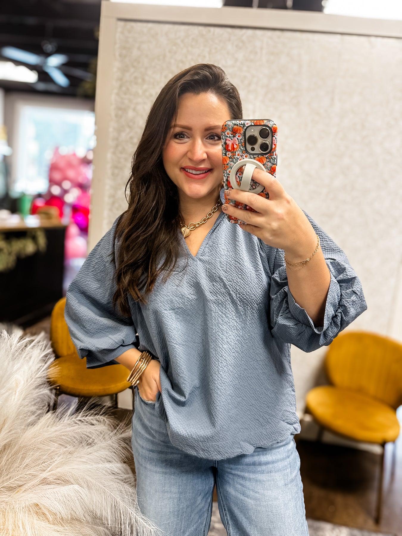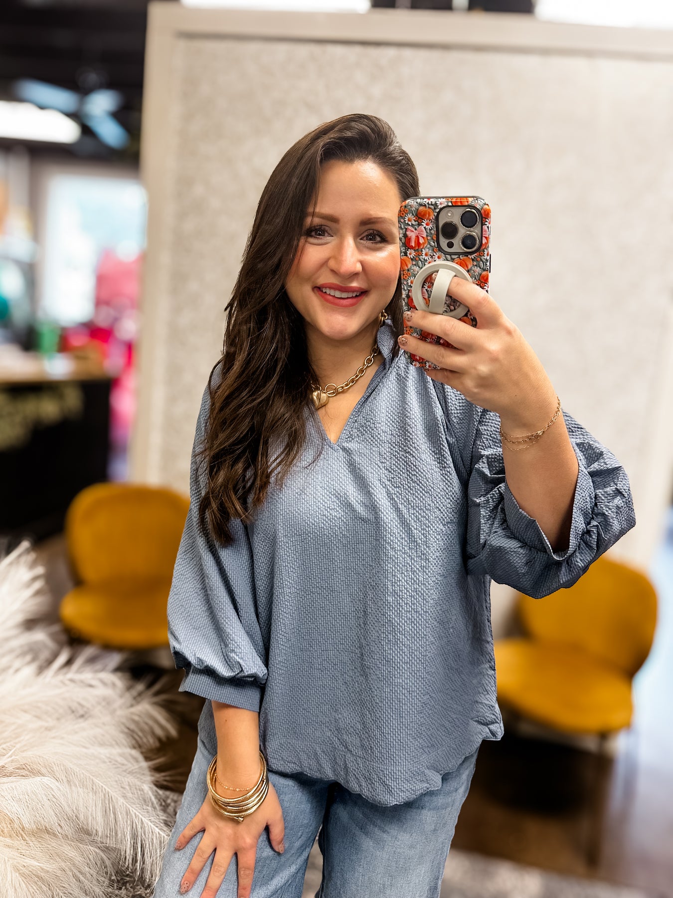 This textured top features a split V-neckline, airy balloon sleeves, and a scalloped hemline for the prettiest finishing touch. Relaxed but polished — perfect for work, dinner, or any winter outing.