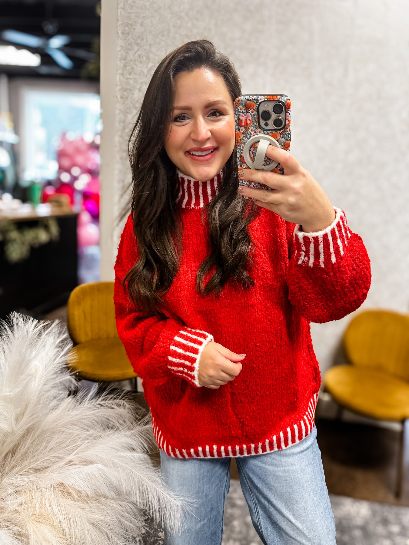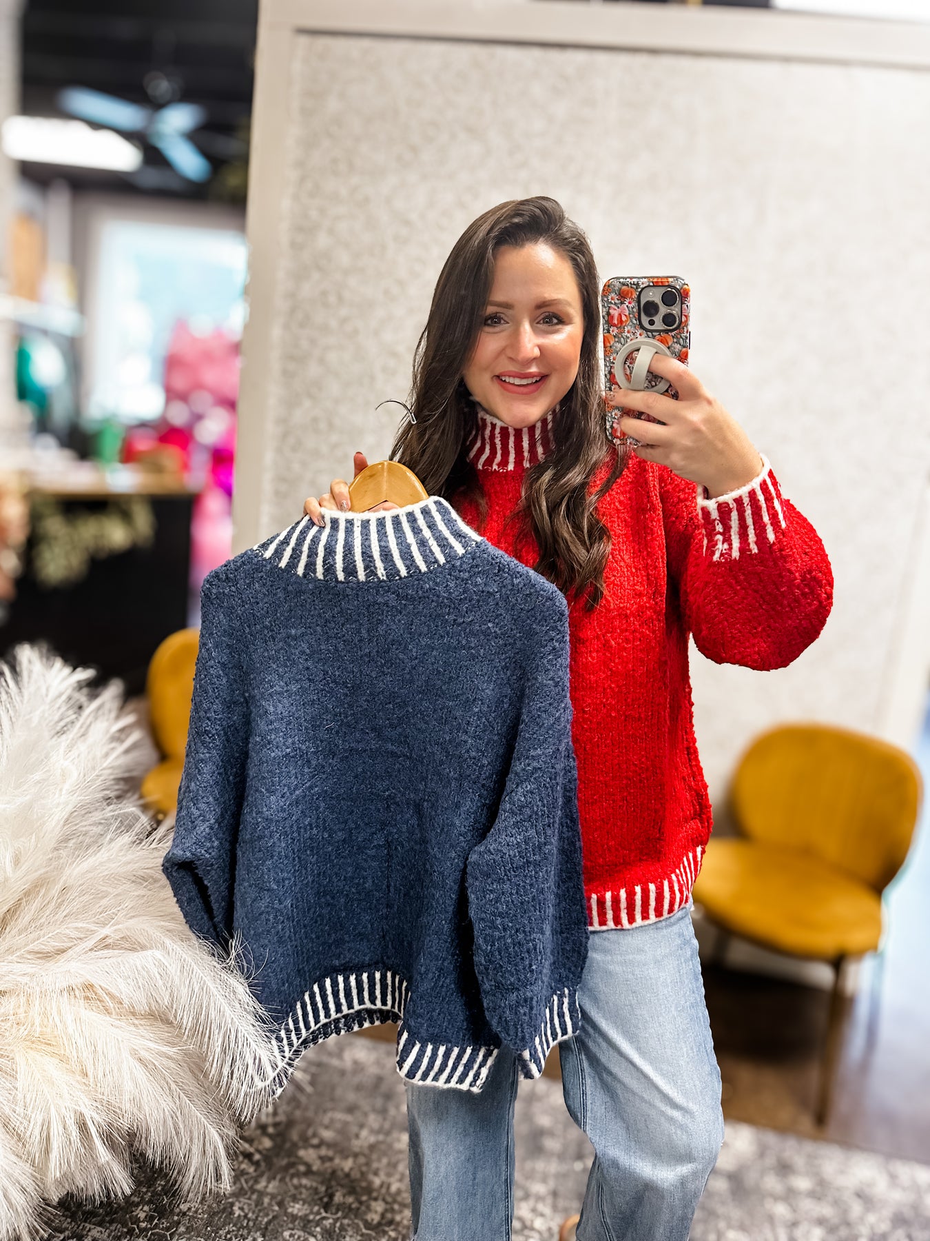 Wrap yourself in warmth with our Snow Lodge Sweater! This cozy navy knit features bold white contrast stripes at the collar and cuffs, giving it that après-ski, fireside-cocoa feel. Style with denim or leggings for the perfect winter look.