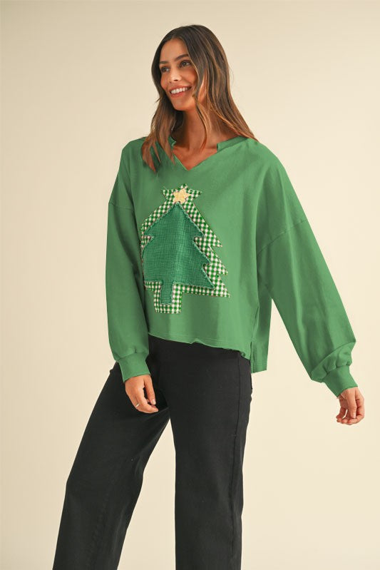 Bring all the cozy Christmas vibes with the Merry & Bright Mineral Wash Tree Pullover. Crafted from soft 100% cotton French terry, this loose-fit sweatshirt has that lived-in, vintage look thanks to its mineral-washed finish. The notched neckline adds a trendy touch, while the gingham-trimmed Christmas tree patch front and center makes it instantly festive.