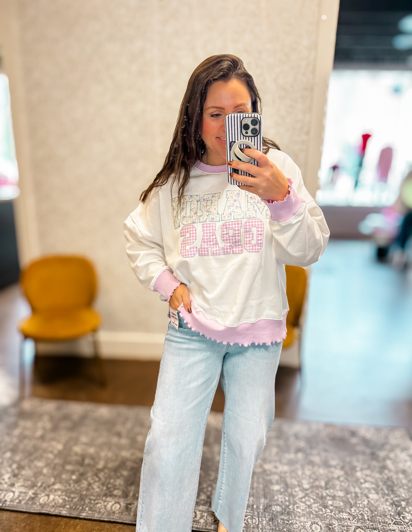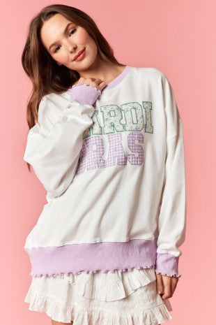 Our Mardi Gras patch embroidered sweatshirt is packed with personality—from the bold “Mardi Gras” patch lettering to the delicate embroidery details and playful wavy hem finish. It’s the perfect mix of comfy and statement-making.