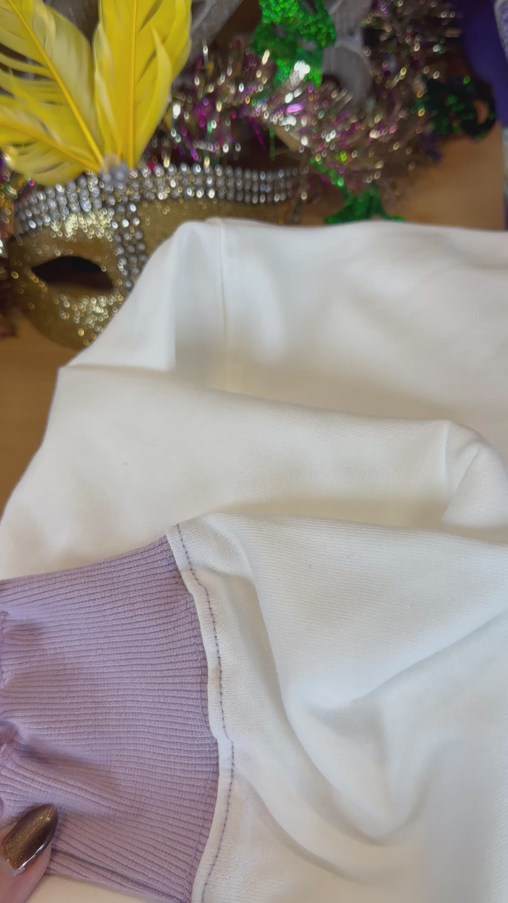 Designed with a relaxed fit and soft cotton-blend fabric, this sweatshirt is easy to wear all day—parades, parties, king cake runs, you name it. The pastel accents keep it fun and feminine while still delivering full Mardi Gras spirit.