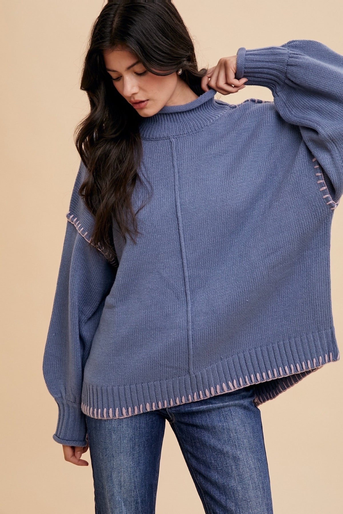 Your new cold-weather crush has arrived. The Winter Whimsy Stitch Sweater features a soft mock neckline, cozy loose fit, and the prettiest contrast stitching that adds just the right pop of detail. The relaxed silhouette drapes beautifully, while the unique penguin-slit back gives it that effortless, elevated vibe.