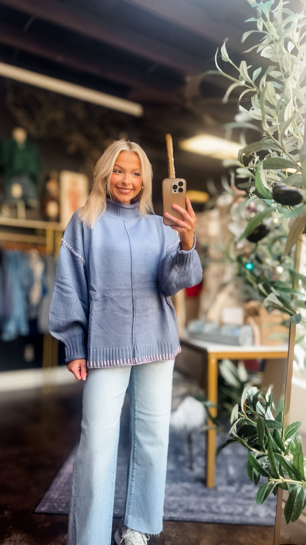 In a dreamy cool-tone knit, this sweater pairs flawlessly with denim, leggings, or layered basics — perfect for chilly mornings, holiday outings, or cozy nights in. It’s one of those “throw on and instantly cute” pieces we all need in our winter rotation.
