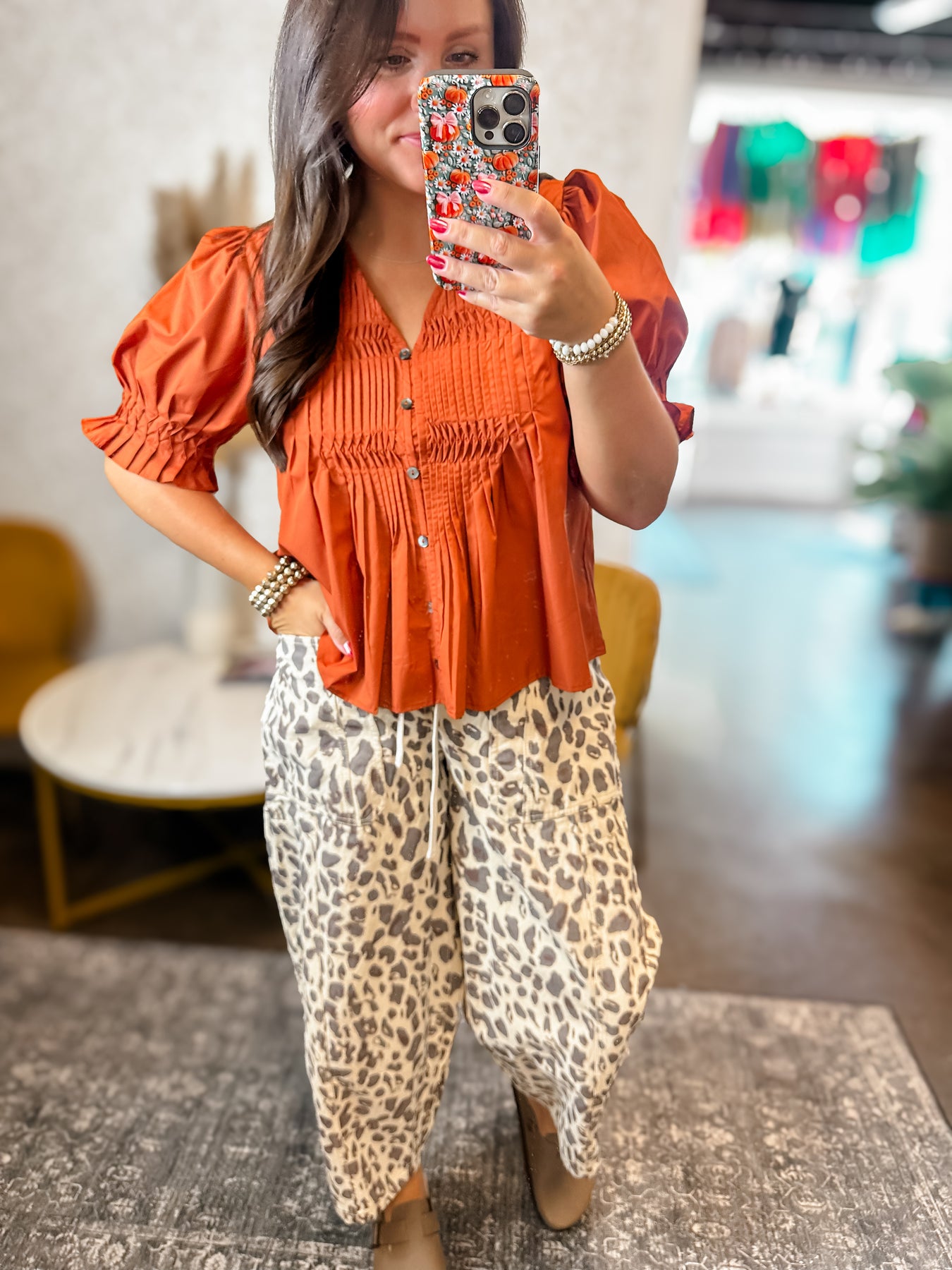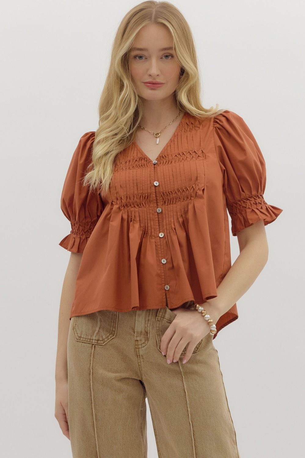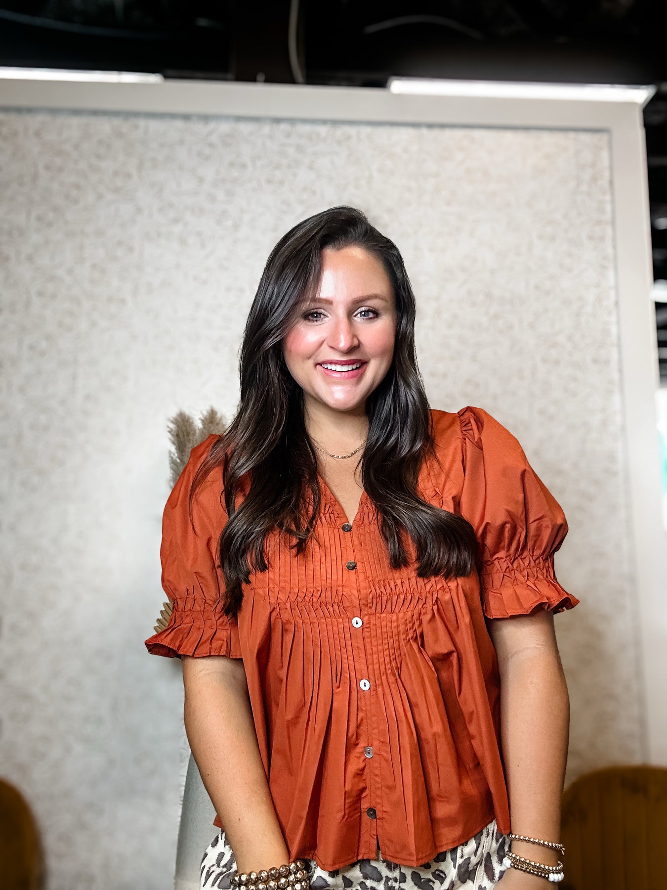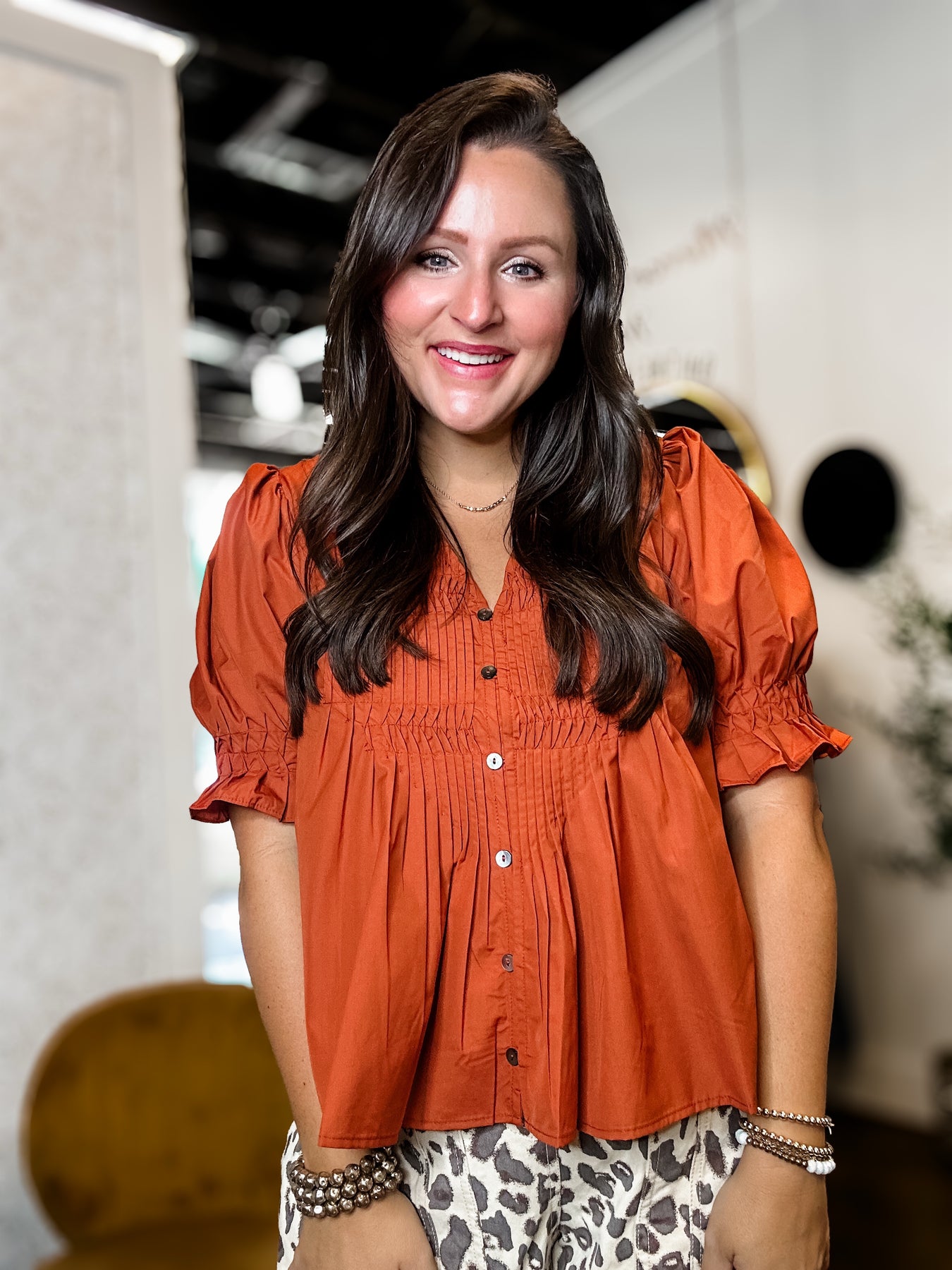 Cozy meets chic in our Pumpkin Spice Smocked Blouse. With its rich autumn hue and flattering pintuck detailing, this lightweight woven top brings the perfect mix of structure and flow. The short puff sleeves with smocked cuffs add a touch of playful femininity, while the button-down front keeps it classic. Pair it with denim, corduroy, or skirts for an effortlessly polished fall look.