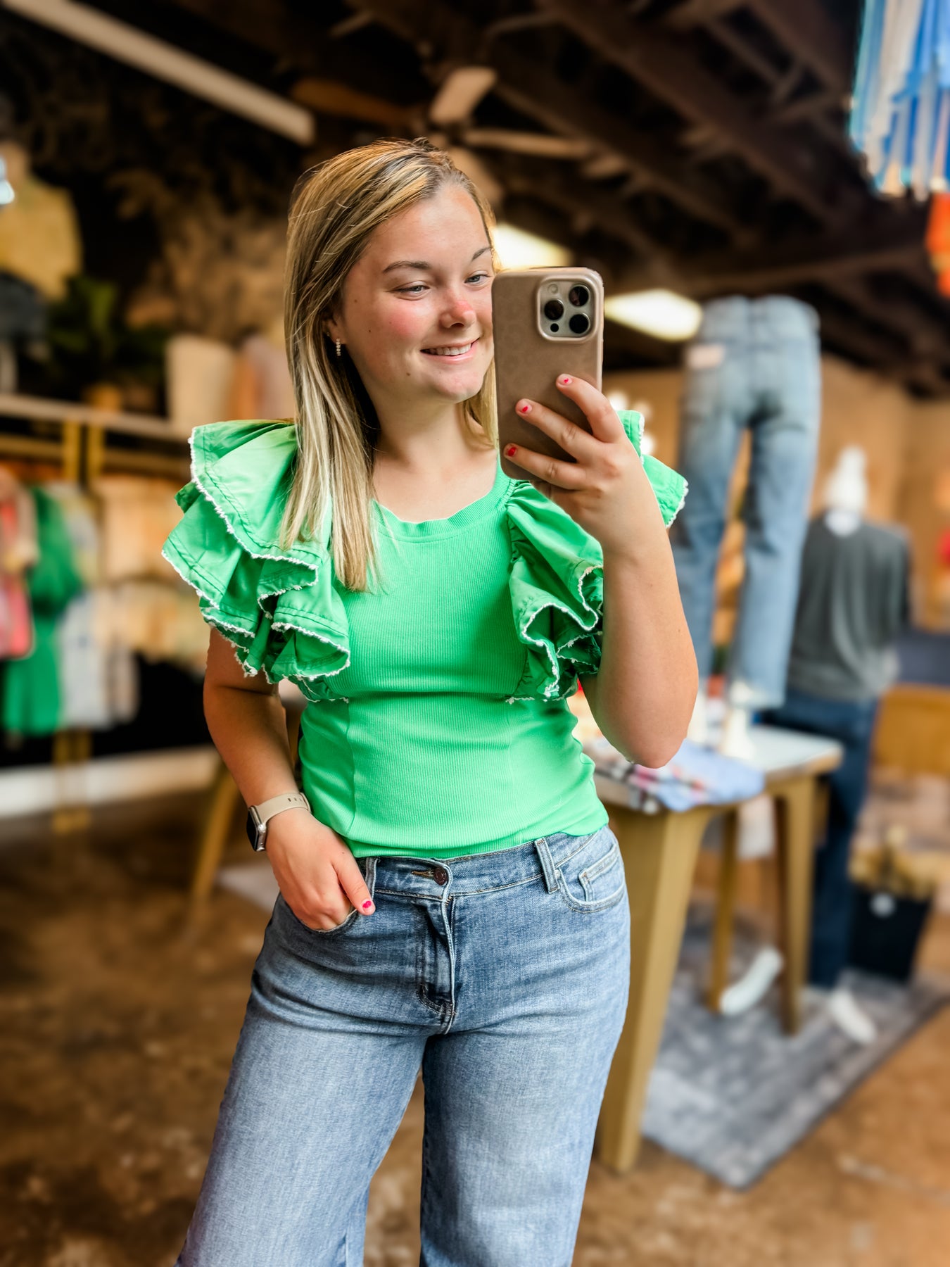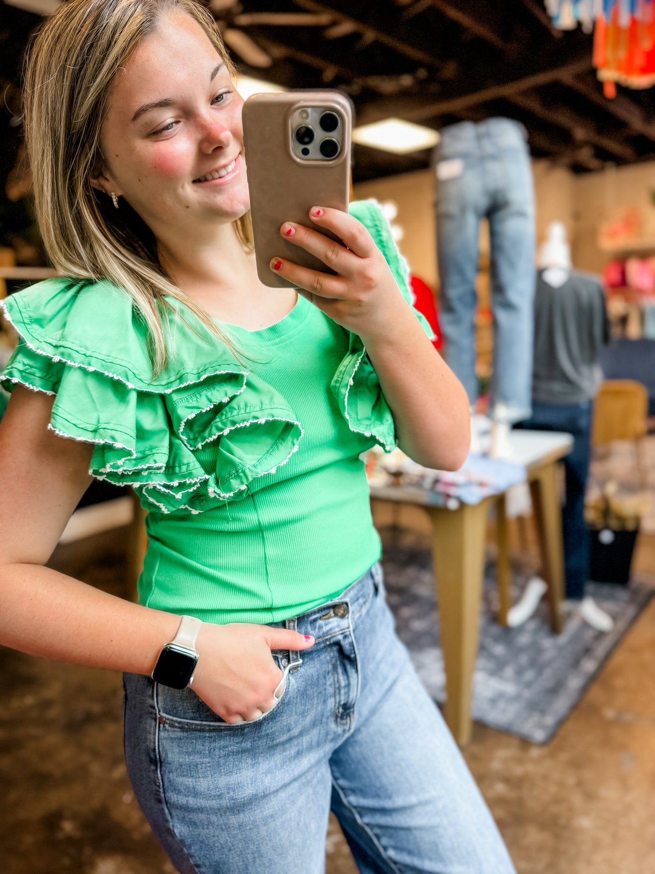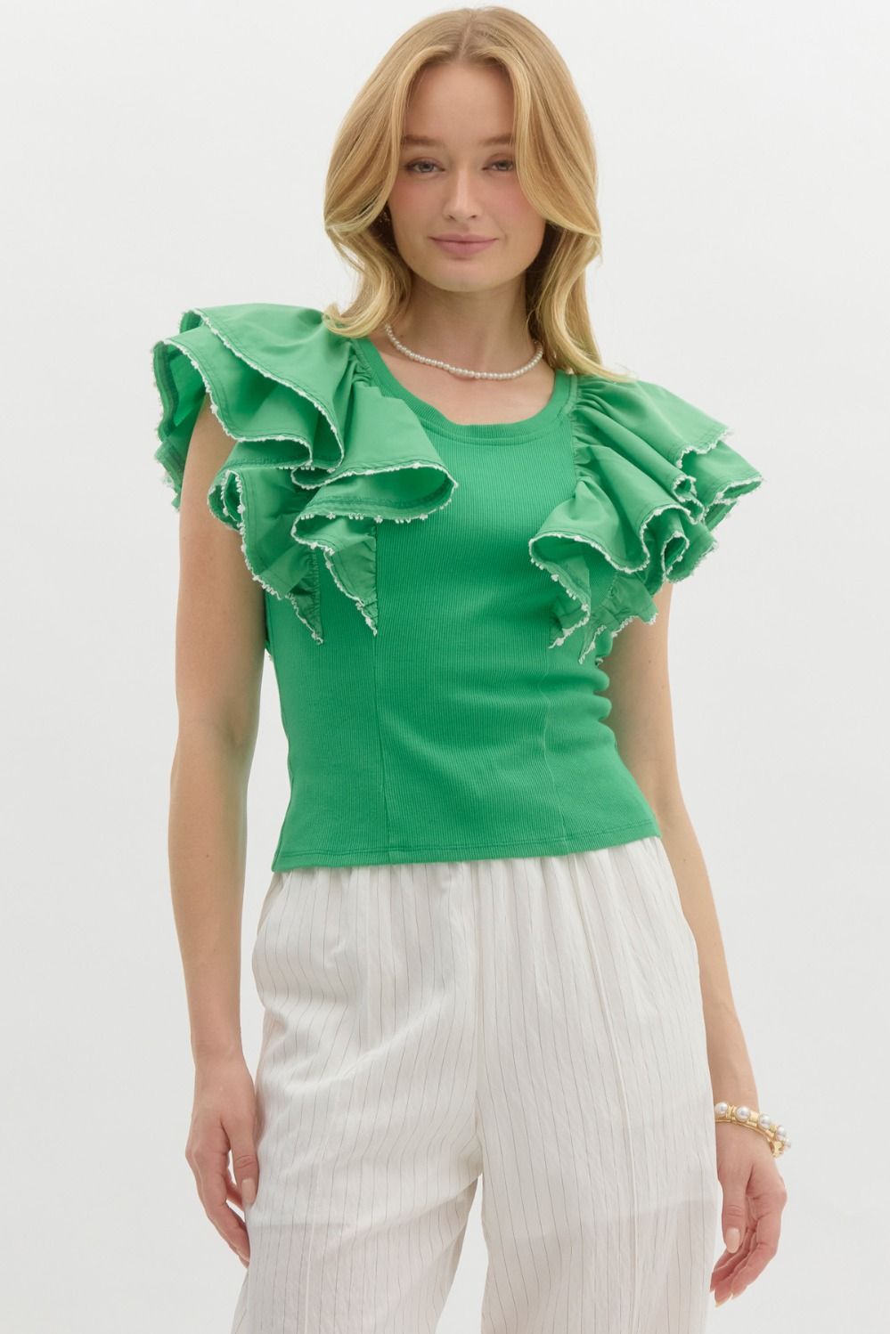 Elevate your style with our solid rib jersey fitted pullover top! Featuring a voluminous double layered ruffle over the shoulder, accented with contrasting edge trim, this top adds a touch of elegance to any outfit. The lightweight, non-sheer knit provides comfort and versatility. Unleash your inner fashionista with this must-have piece!
