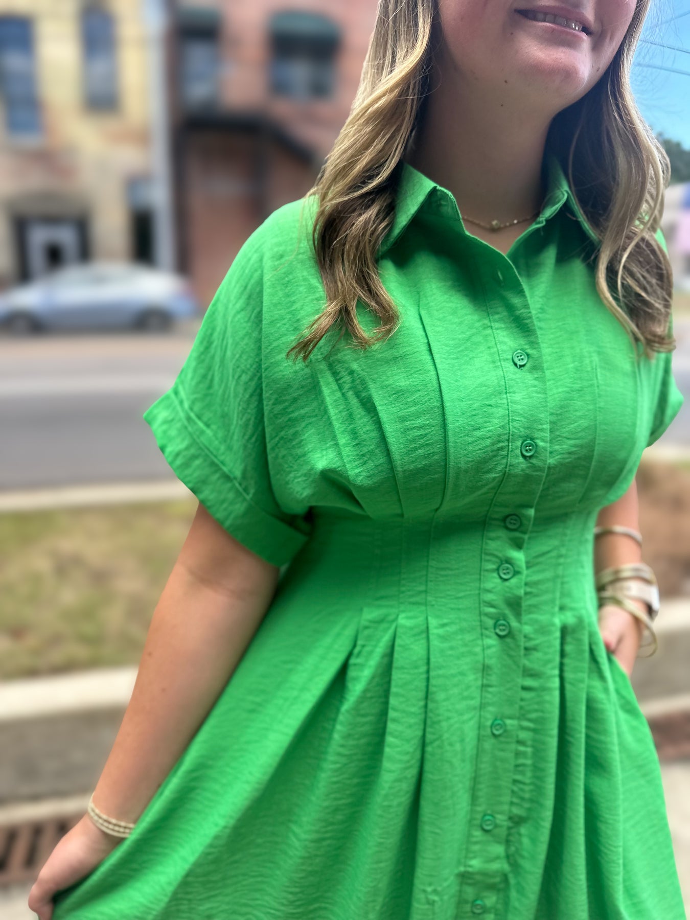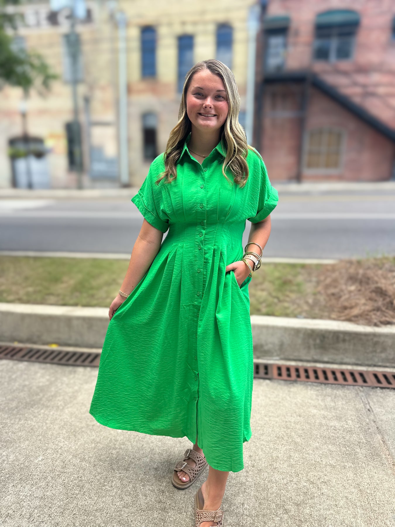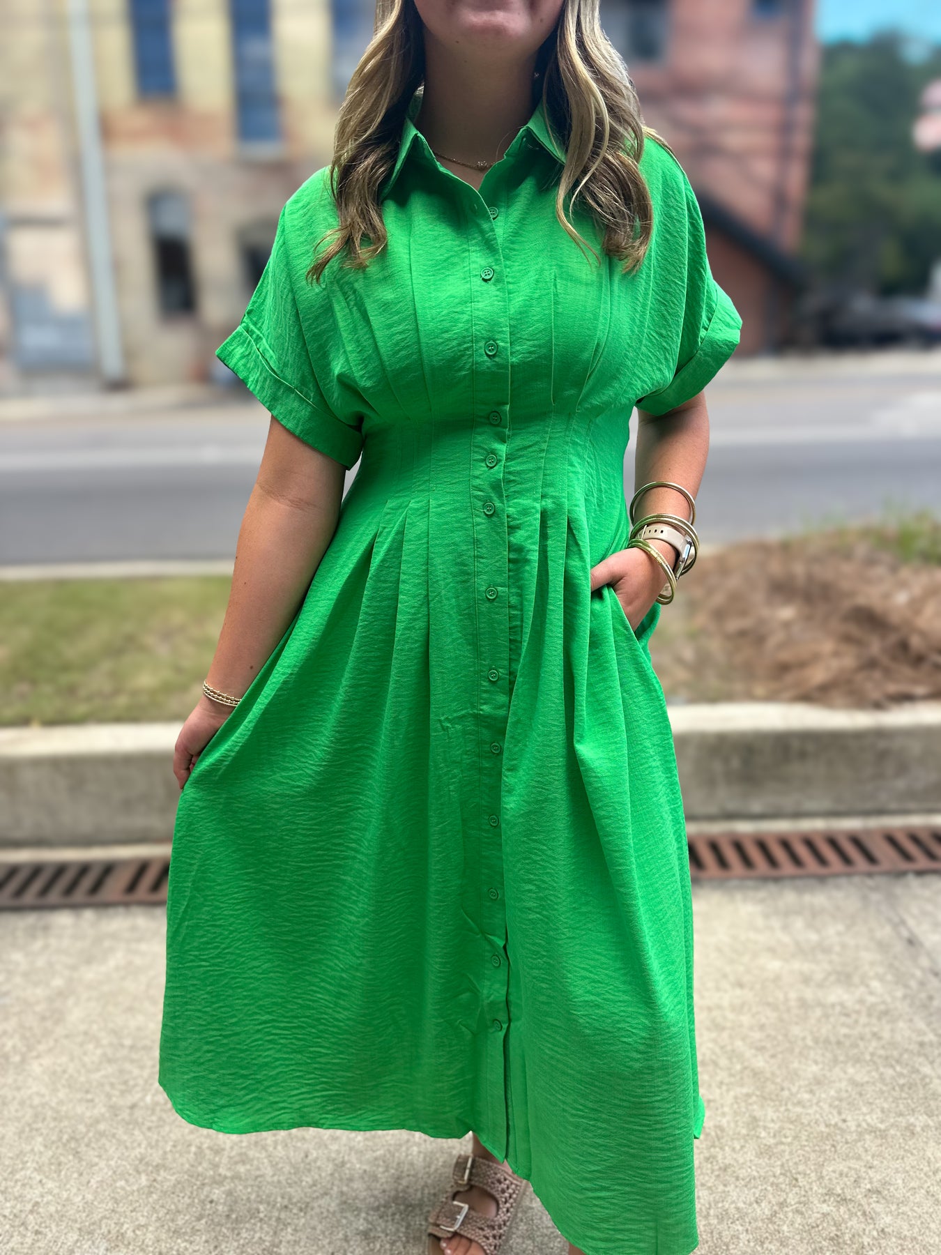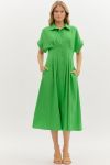 Bring on the compliments. The Lawn Party Midi is an effortless blend of structure and femininity, featuring a classic collar, relaxed short sleeves, and a flattering full midi skirt with hidden side pockets (yes, please!). The crisp silhouette in this bold green hue makes it perfect for everything from back-to-school events to early fall outings.